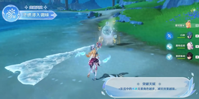 因为你看她的第一个天赋:“队伍中的水冰元素角色越多,减抗效果越强。”