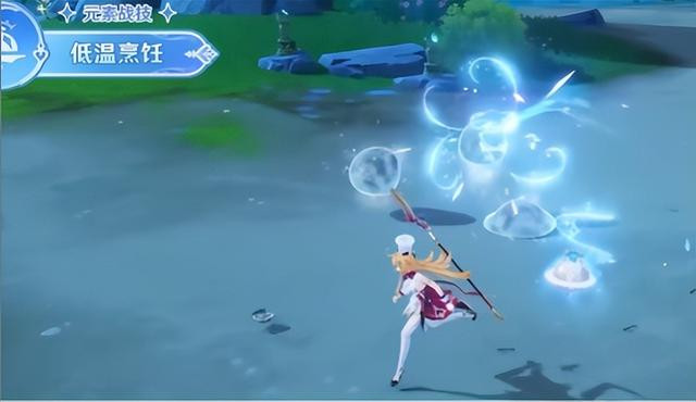 然后她的E技能“点燃”是召唤一个餐盘机关,跟随角色协同攻击,释放时获得四颗能量球,协同攻击的频率是一秒一次,持续时间是20秒以上。因为前瞻演示这里一直到切画面,大概20秒都没有消失,那这个持续时间的话,大概率是个无冷却(或冷却时间短于持续时间)的技能。